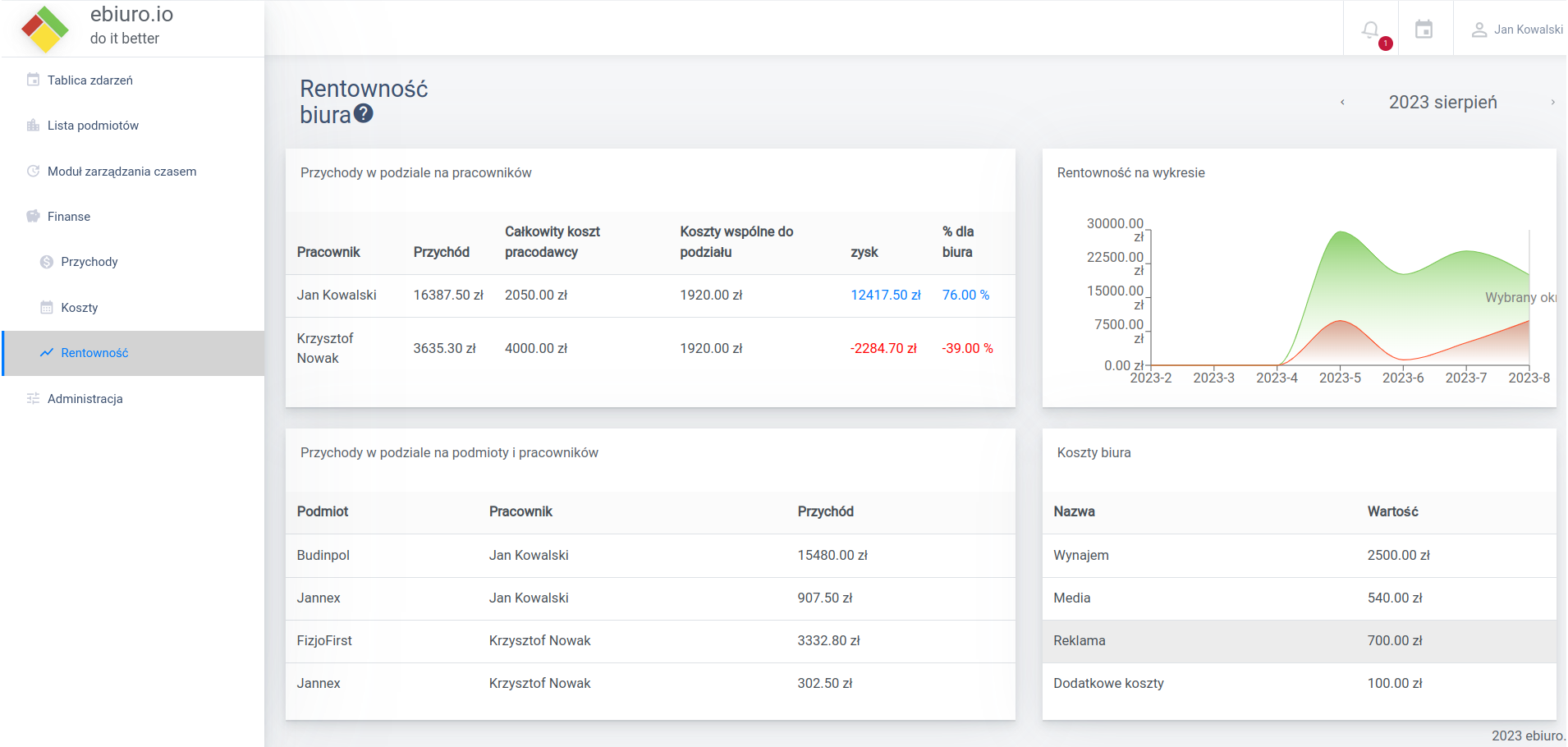 System za pomocą zaawansowanych algorytmów i wprowadzonych danych wylicza rentowność biura w podziale na miesiące.